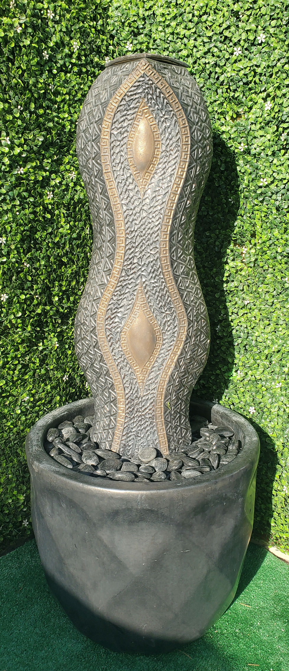 This is one of our Signature Line water features which includes a top piece made out of high fired ceramic, a basin and water pump. You can choose from a 4’ or 5’ height, by mixing and matching the fountain top (3’) with the fountain basin (1’ or 2’).